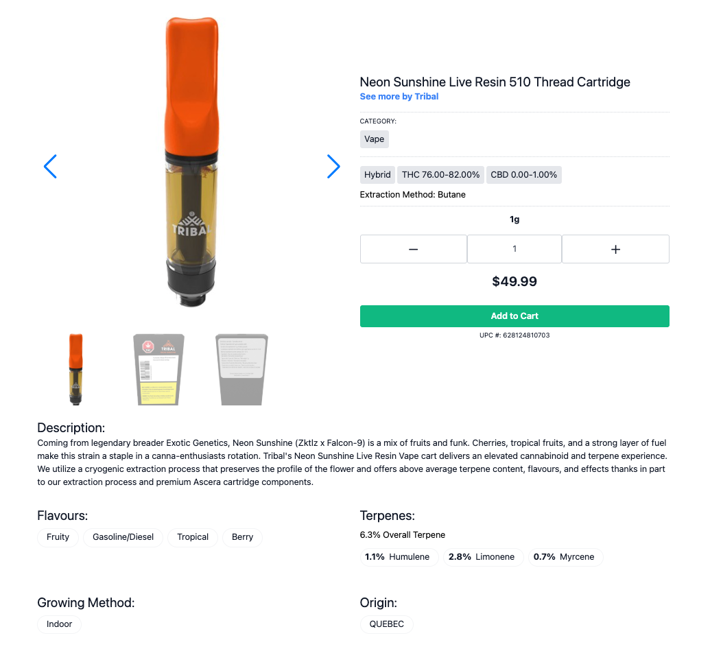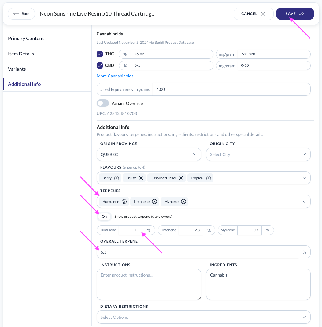 NOTE: Buddi typically displays terpene names (for example, Myrcene, Limonene, Linalool) when this information is available. We generally do not enter specific terpene percentages, as terpene composition can vary from batch to batch and does not sync automatically from POS systems. Retailers who want to update a product’s terpene list or display batch-specific terpene percentages can edit the product directly in 'My Menu'. To show terpene %, the values must be entered and the display option enabled within the listing.